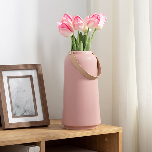 Matte Pink Ceramic Tapered Vase with Faux Leather Handle