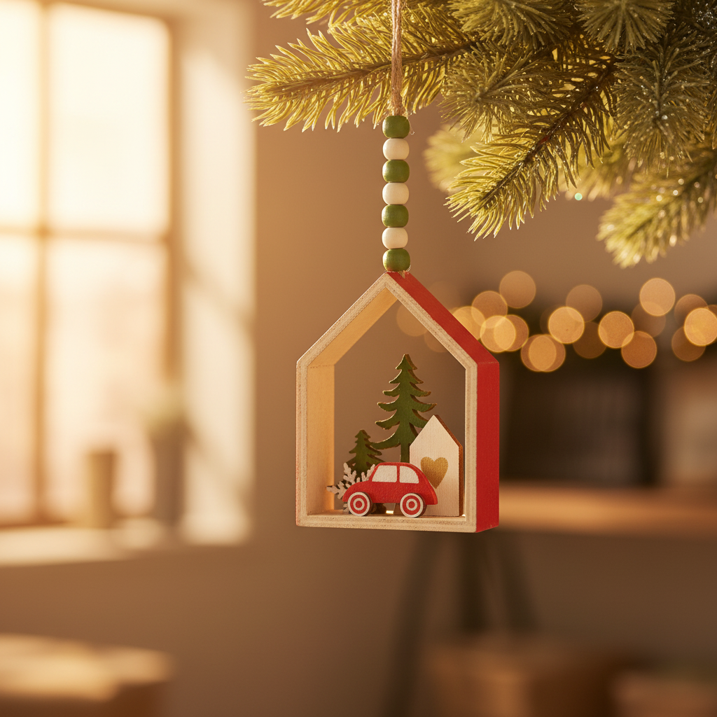 Celebrate the joy of the season with this charming Red House and Car Christmas Ornament. Featuring a vibrant red house with a little car carrying a Christmas tree, this ornament brings a whimsical touch to your holiday decor. Perfect for tree branches or as a unique addition to your festive display.