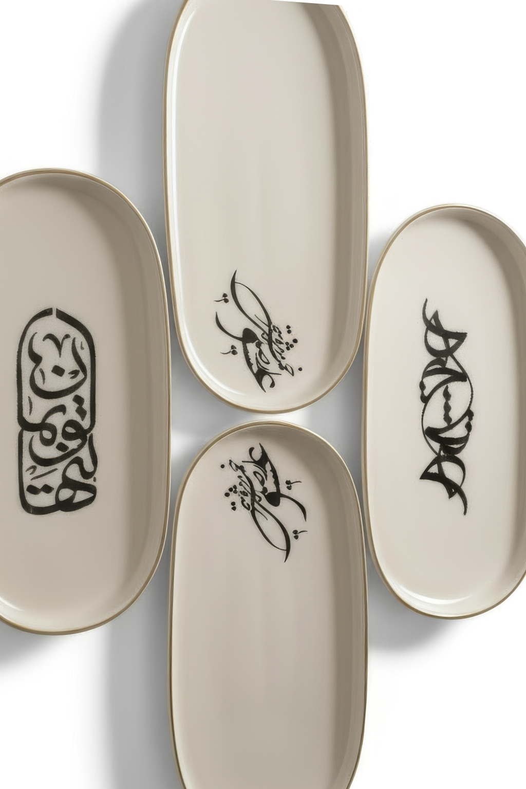 Embrace the timeless elegance of Persian culture with the handcrafted Black and White Oval Tray by Hedieh. This exquisite tray features a white base adorned with intricate black patterns, including poetry, calligraphy, and Kufic script, evoking the beauty and symbolism of ancient Iran. The gold-edged rim adds a luxurious touch, making it an ideal piece for both decorative and functional use.