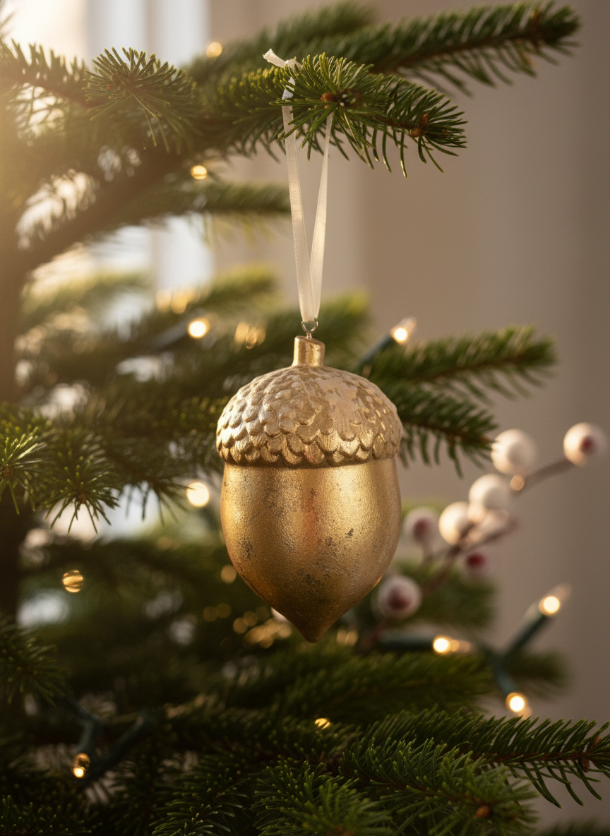 Available in two sizes, the large acorn measures 3.5" in diameter and stands 4.75" tall, while the small acorn measures 2.25" in diameter and stands 3.75" tall. Perfect for mixing and matching or displaying as a statement piece, this ornament brings a festive and natural elegance to your seasonal decor.