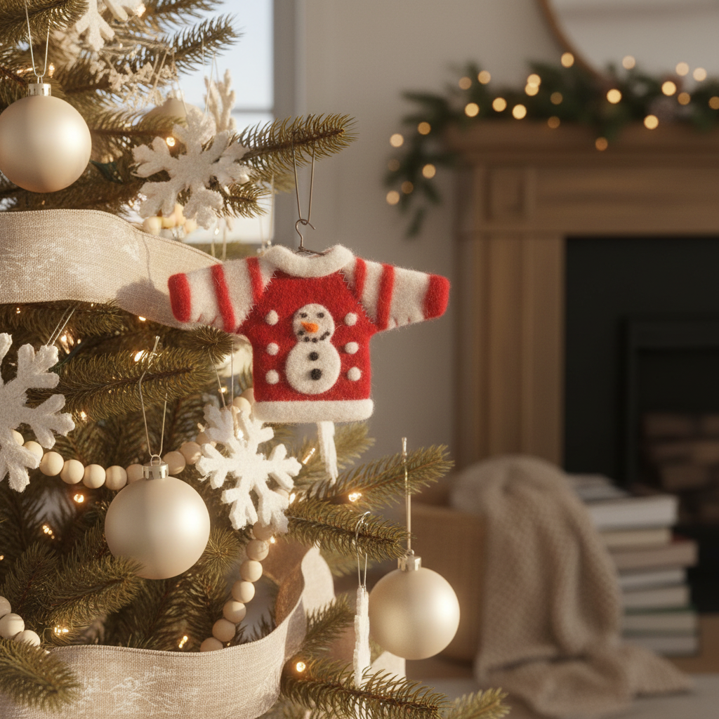 Add a bit of fun and charm to your holiday decorations with this delightful felted wool snowman sweater ornament. The red and white design with its playful snowman details makes it a perfect addition to your festive tree or garland.