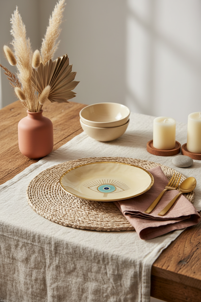 Another piece from our famous Rough Nazar Collection, known for its blend of tradition and elegance. Crafted from high-quality ceramic, featuring a glazed, stamped exterior and a hand-painted Nazar evil eye, it symbolizes protection and good fortune. The 18k gold-plated details add a touch of luxury, making it both beautiful and meaningful.